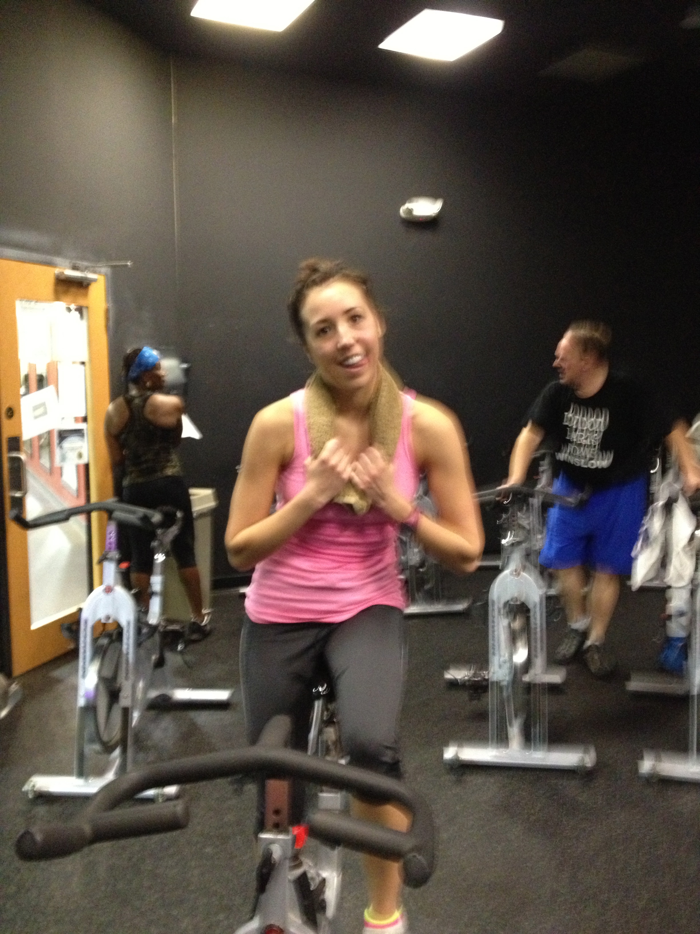 Wednesday’s are a great gym day for me, because I go spinning! I LOVE to spin. I’ve been doing it for 10 years, and I taught in college. The great thing about spin class is that it always challenges me because of all the different moves. Sprints, standing climbs, jumps, hills, flat roads; it’s all great! You control your own resistance and your own speed.