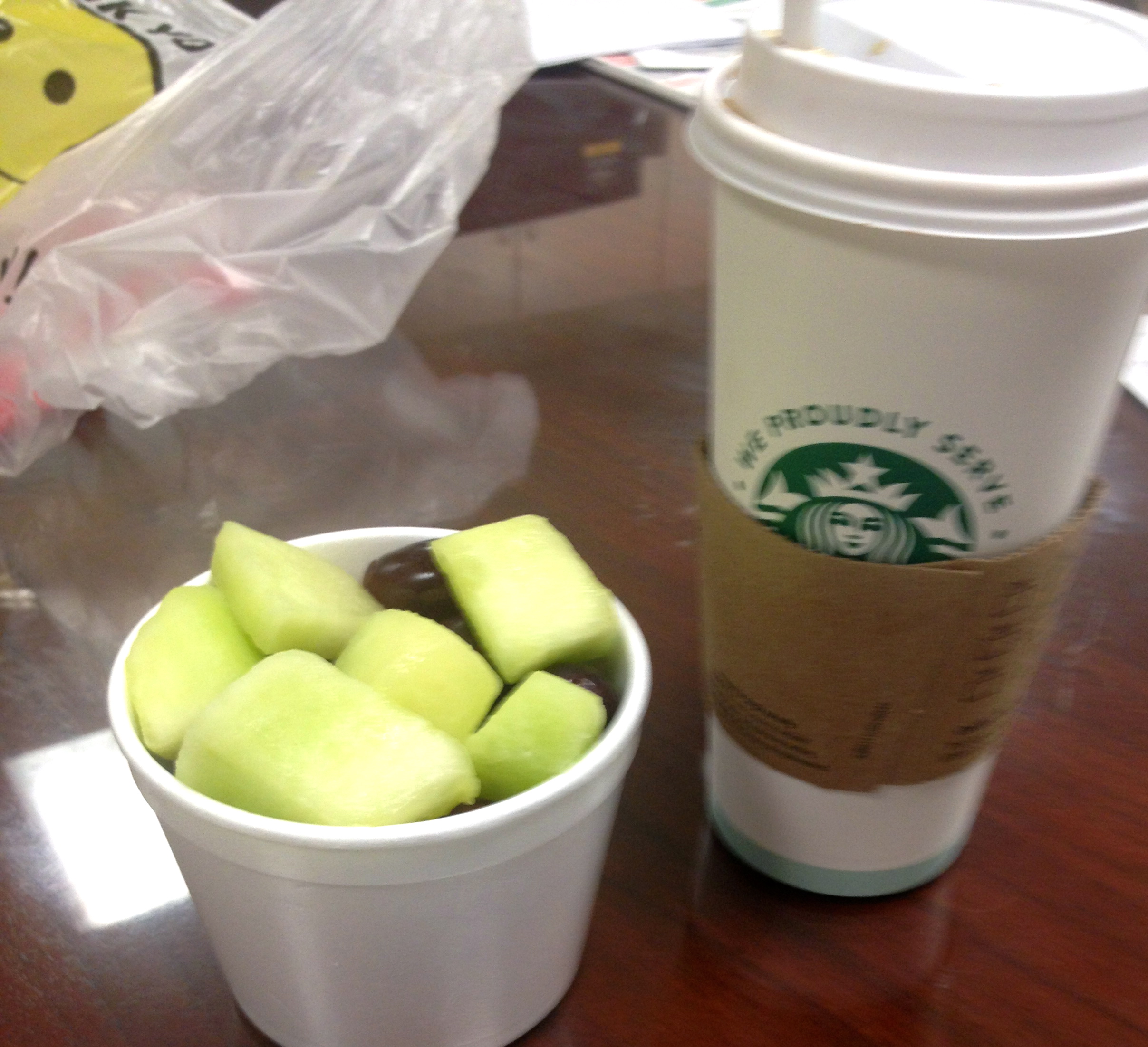 Breakfast time I was starving, so I had some fresh fruit at work, a coffee, and my regular greek yogurt. The fruit was pretty good too!