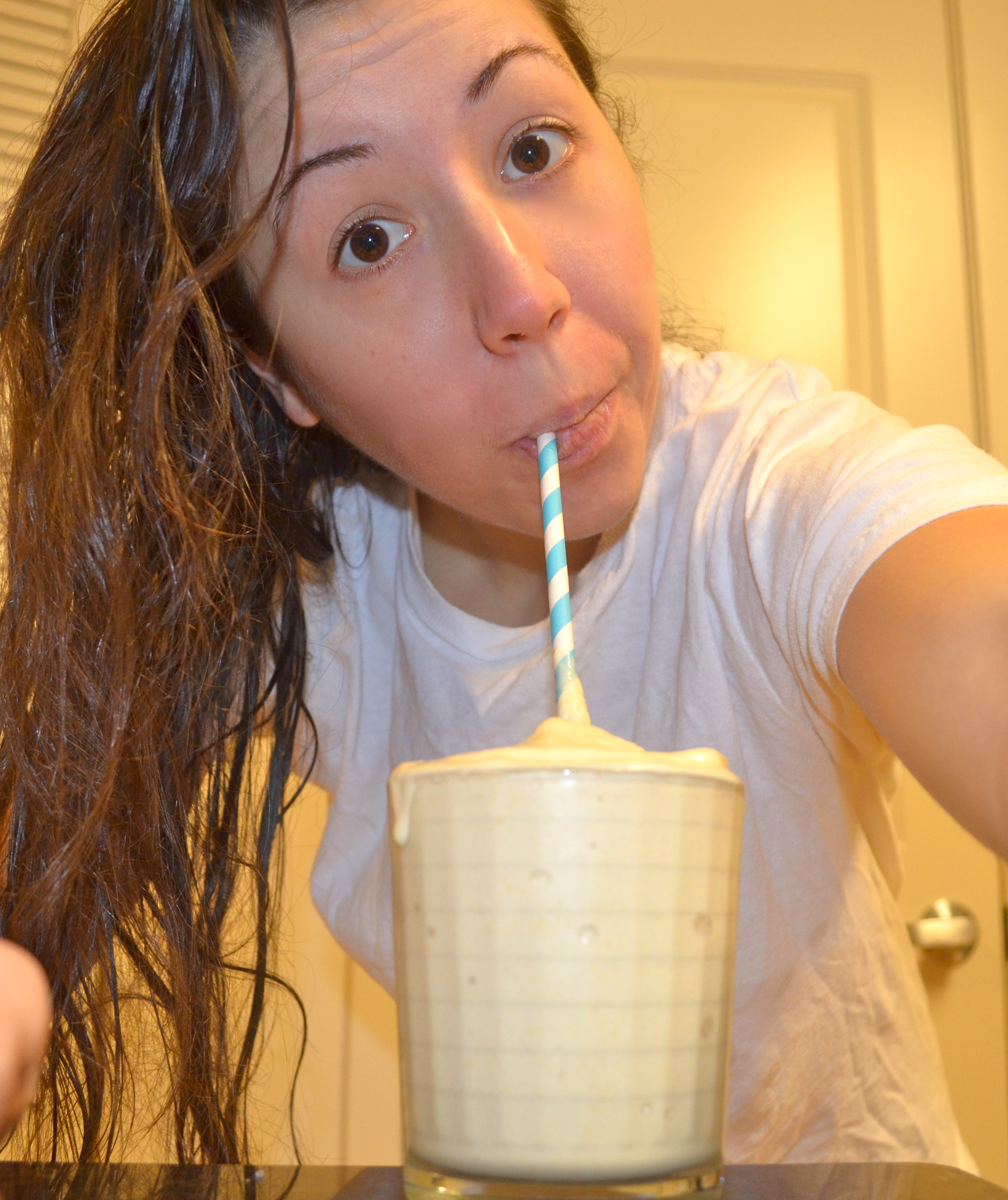 In the morning I had one of my Peaches N Cream Protein Milkshakes! Ingredient included=unsweetened almond milk for U… a stretch but hey not many foods start with U! Ā I scarfed it down after I got out of the shower.