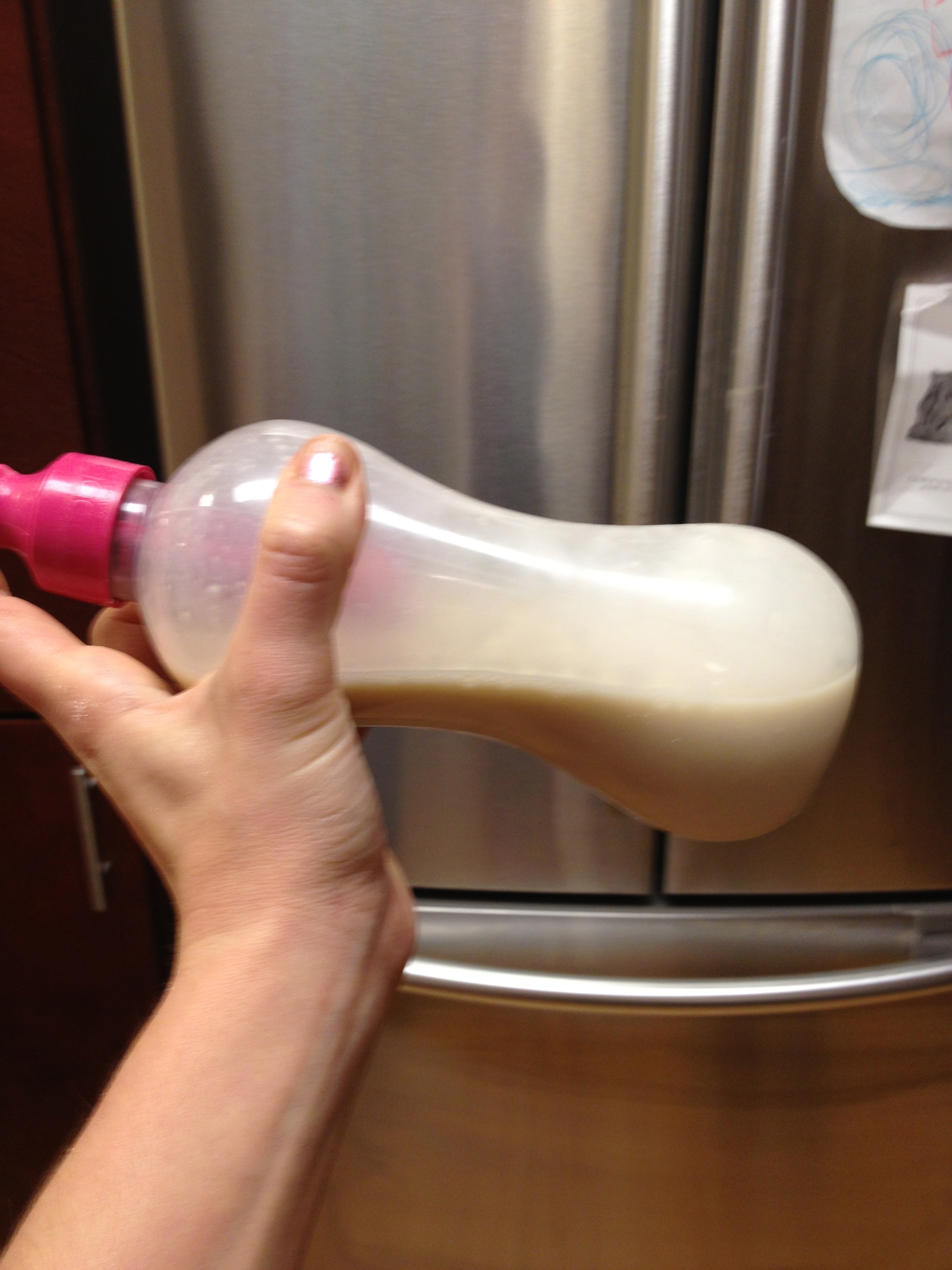 Start with 1 cup of the almond milk (put it in a container you can cover and shake up, I used my “bobble” but any sippy cup or water bottle will do)