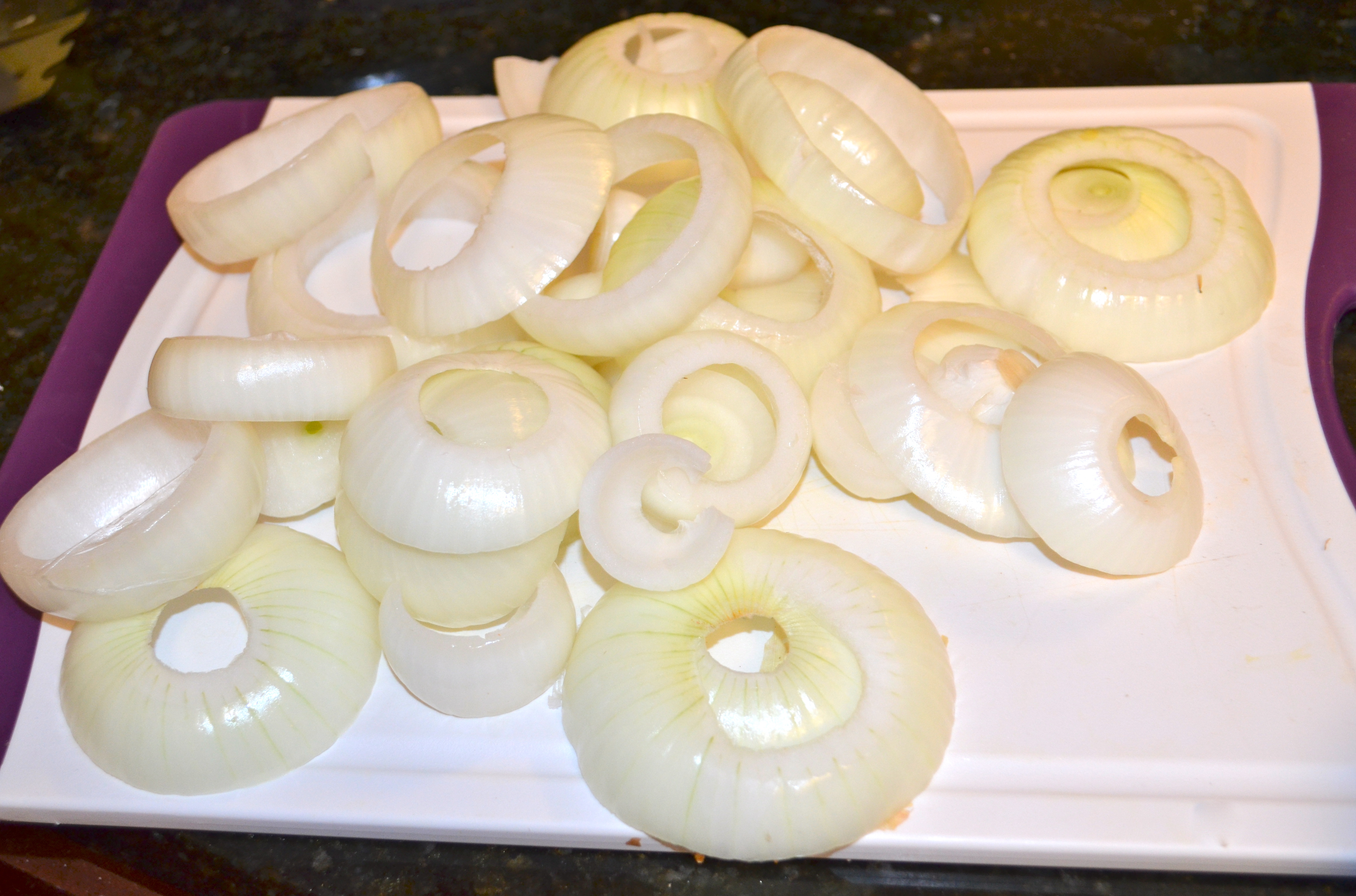 Start by slicing your onions. They obviously need to be in rings. Thickness is up to you! I like about 1/3 to 1/2 of an inch.