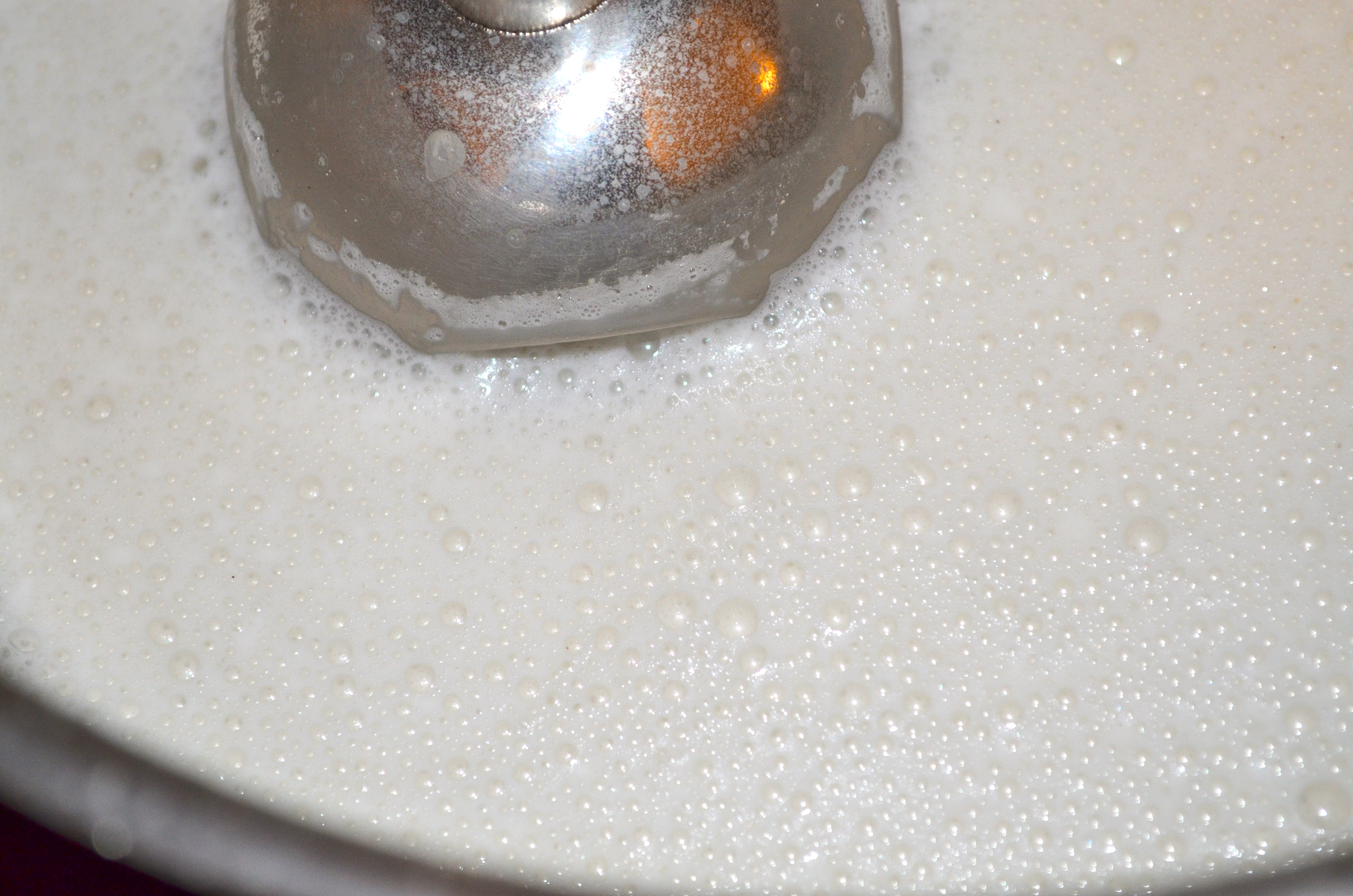 Once your almond milk is warm, take the immersion blender to the bottom of the pot and turn it on. Watch out for splashing! You will start to see the milk foam up