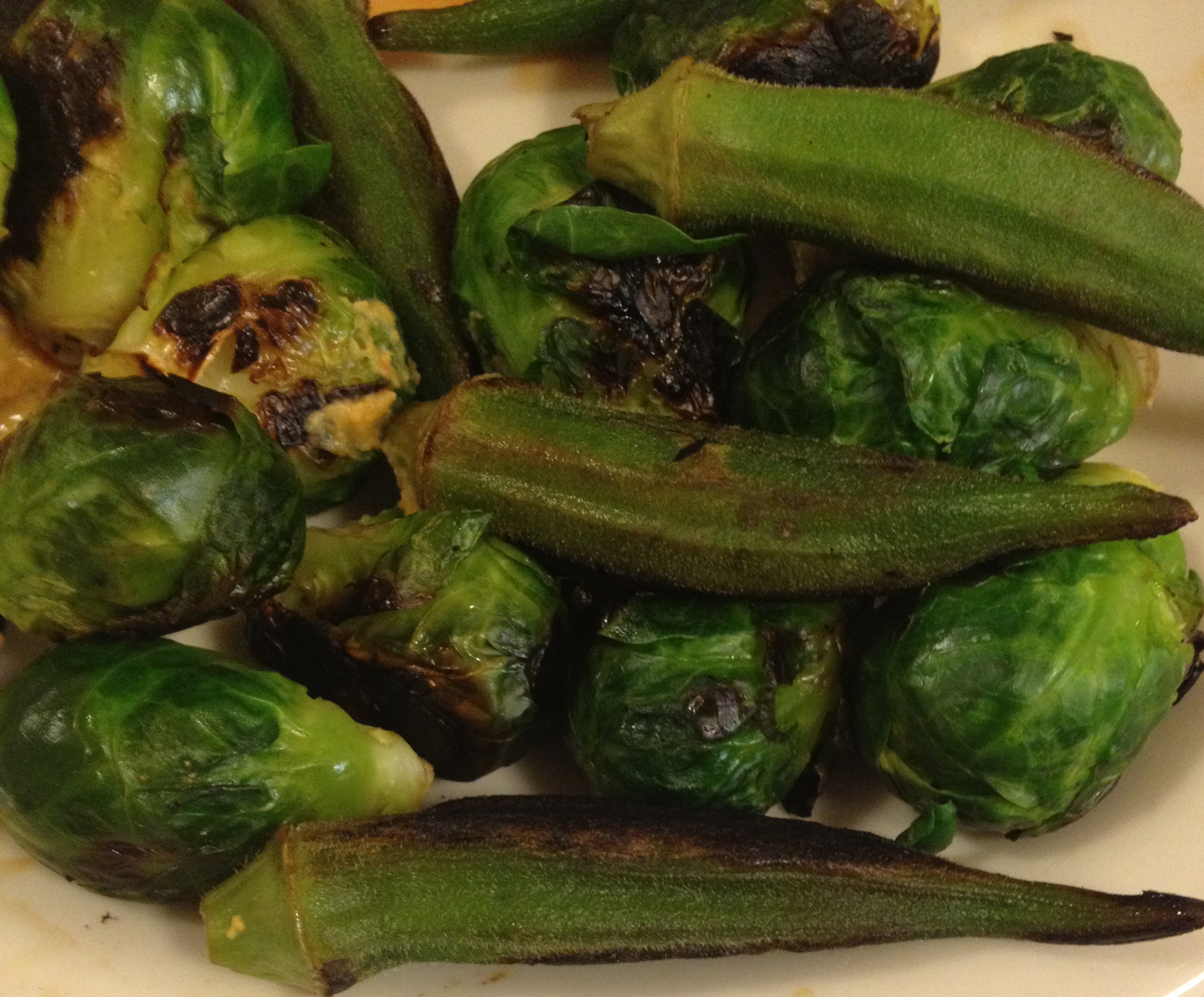 And we made dinner, including okra and brussels sprouts. Try okra roasted or grilled! It has a great spicy flavor. These fresh ones I bought weren’t slimy at all! π