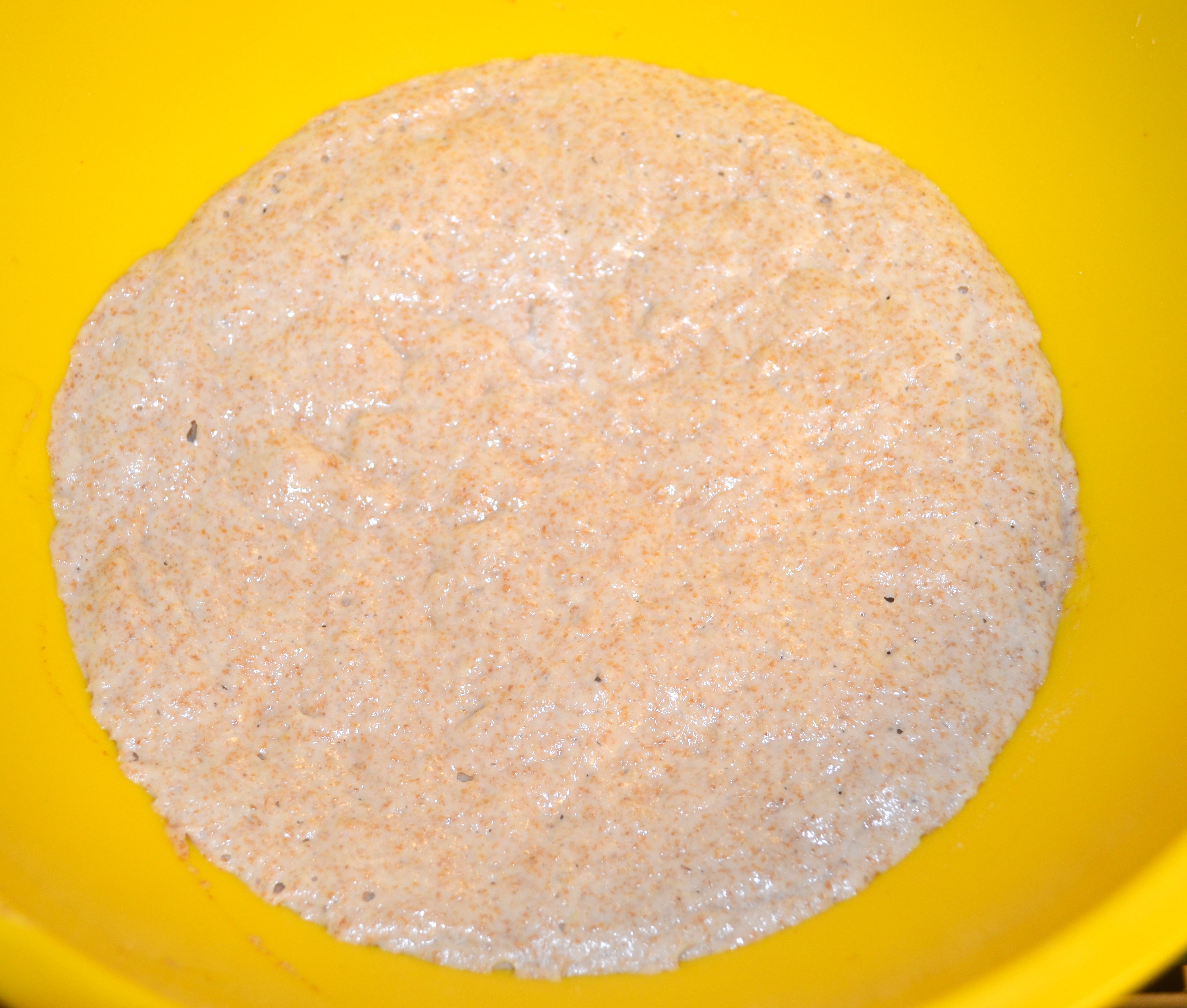 Now here I added the rest of my flour, you want to add 1/2 cup of whole wheat flour and 1/4 cup of regular flour and mix. I ended up refrigerating the dough overnight and using it the next morning to let it rise some more. But you can also work with it right away. Might have to add a tad more flour if you do it this way!