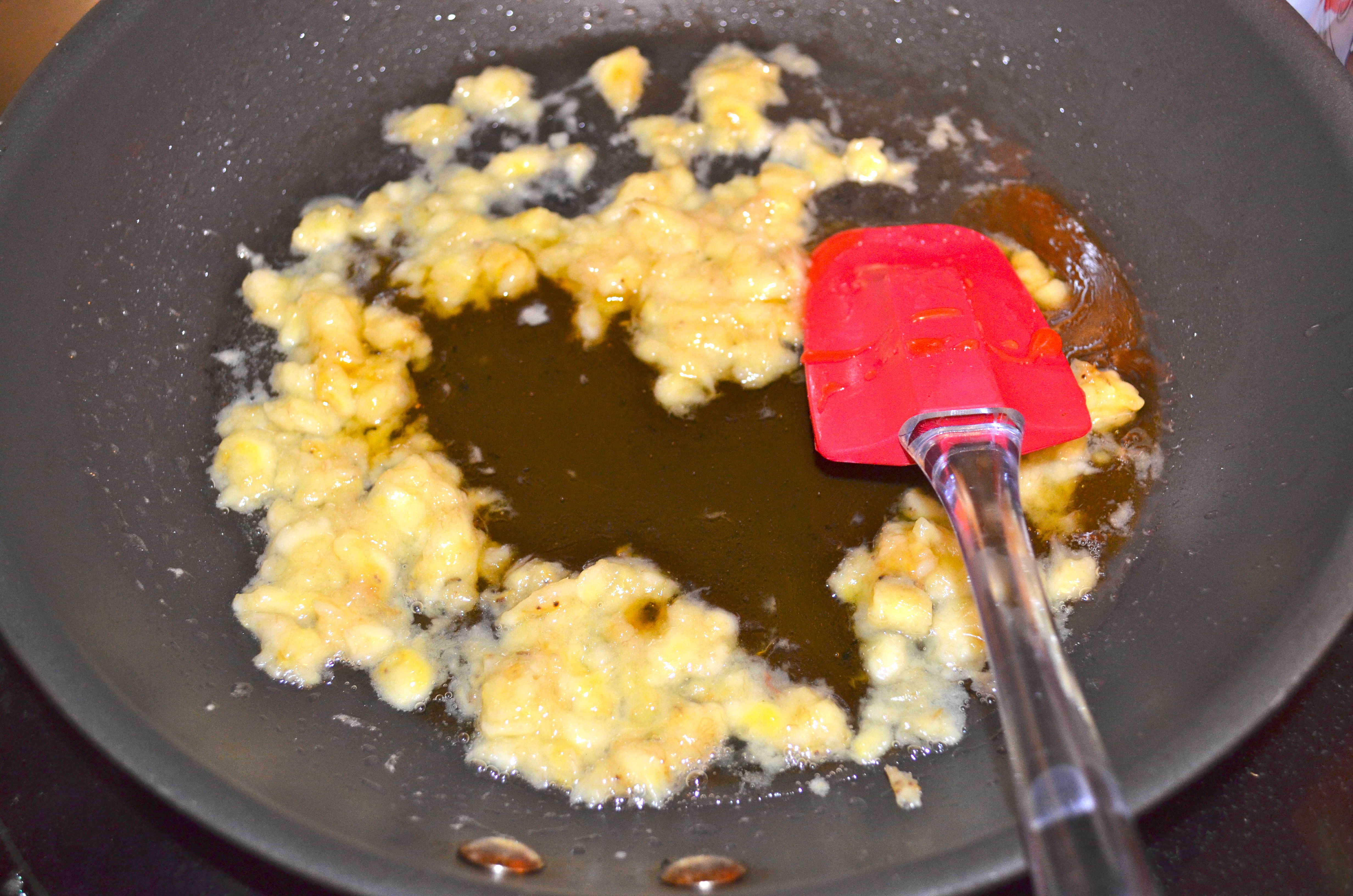 Once it has melted, add the ripe banana and mash in the pan