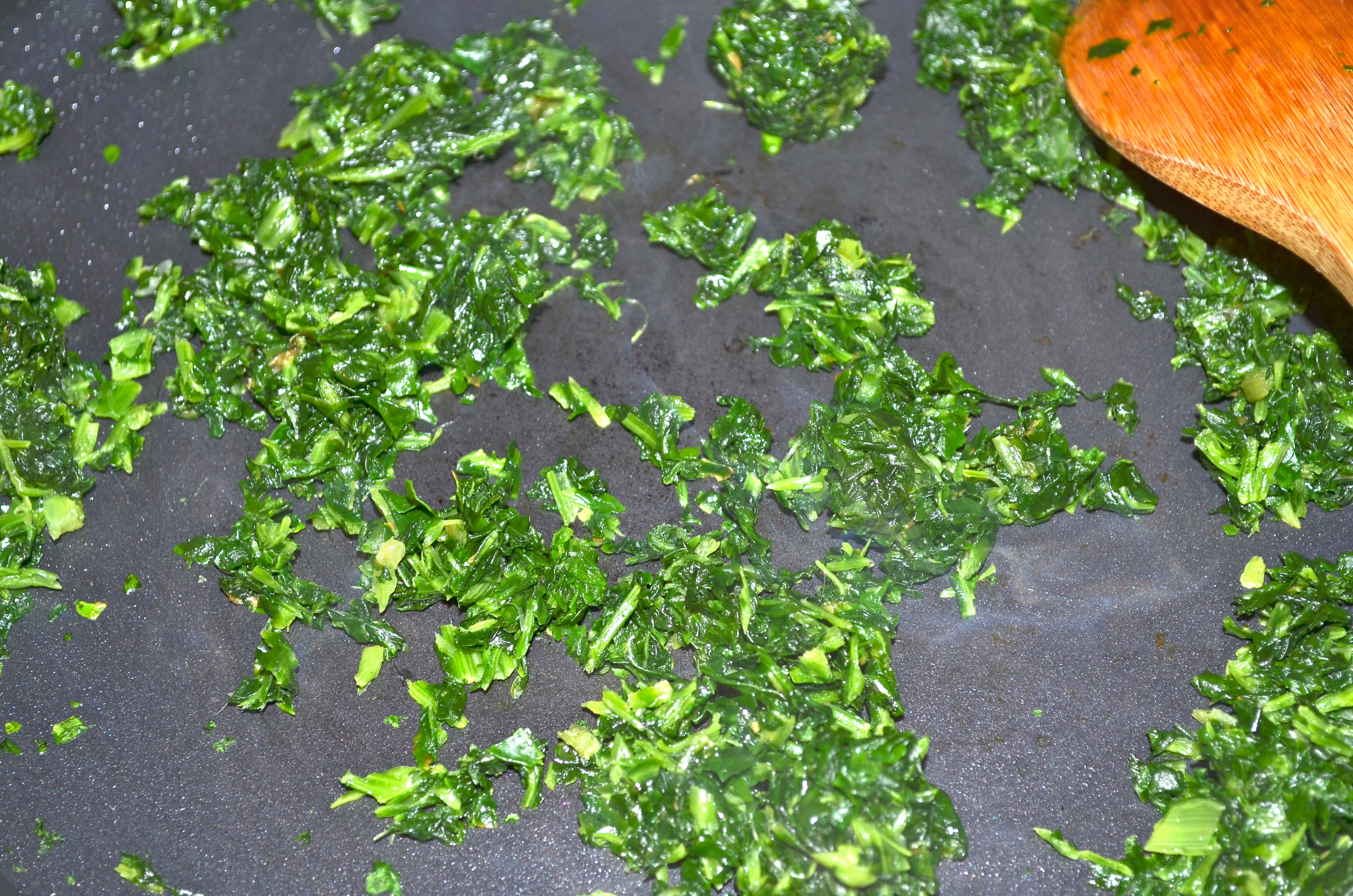 Next the extra virgin olive oil goes in the pan along with the spinach to get some more of that water out, cook on medium heat